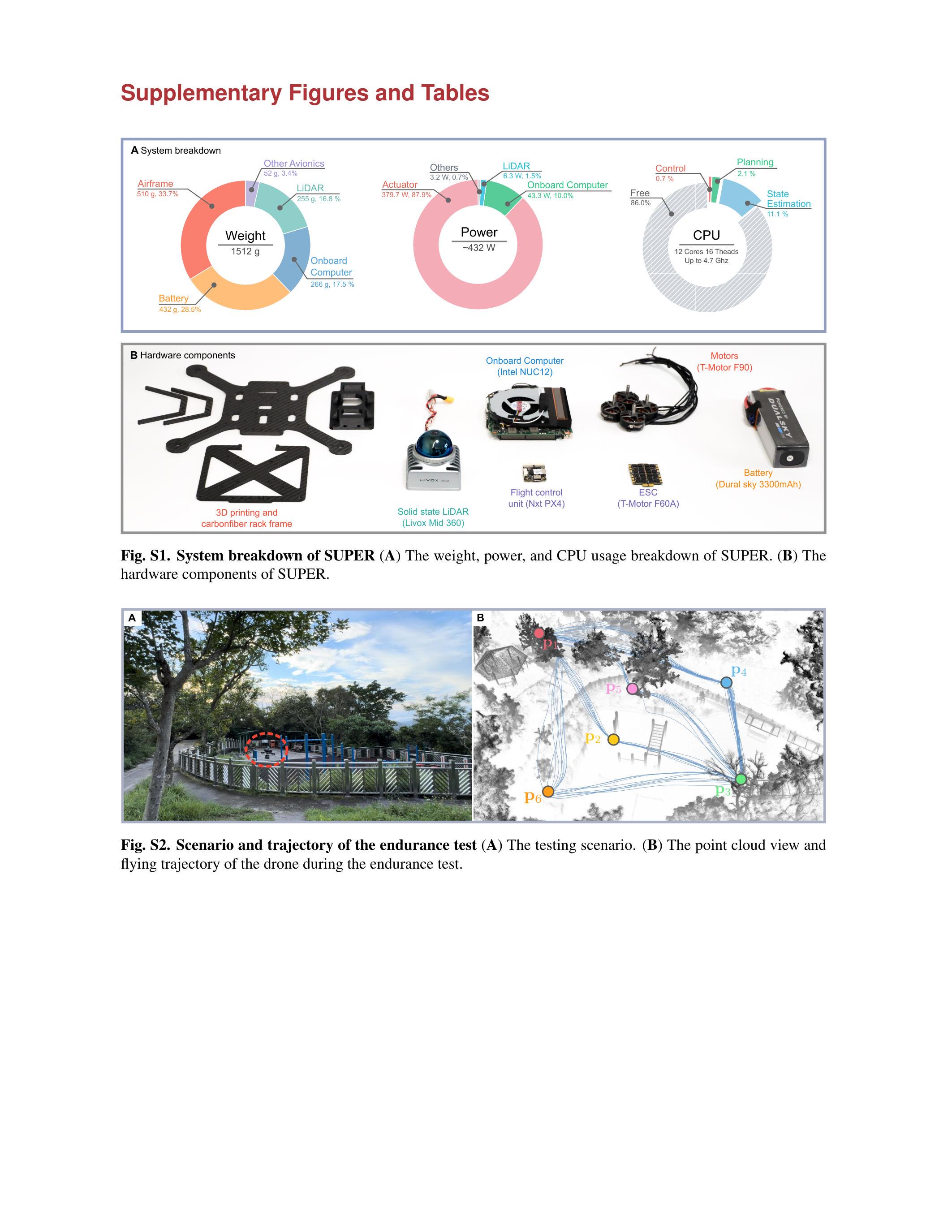 SUPER设计用于依赖机载传感与计算,在未知环境中实现高速导航。灵活性与机载计算能力是两大关键因素。SUPER尺寸为280毫米,推重比5.0,体现高机动性。机载计算单元为搭载12核、4.7 GHz的Intel NUC 12,具备充足计算能力,支持高效在线优化探索轨迹(实现高速飞行)和备份轨迹(保障安全)。高机动性与机载计算能力使SUPER能在未知杂乱环境中实现超过 \(20 \mathrm{~m} / \mathrm{s}\) 的高速飞行且无碰撞。SUPER的安全保障与高速飞行能力使其在现有自主空中机器人中独树一帜(图1A)。Agilicious(33)推重比超5.0,尺寸与SUPER相近,但其基于模仿学习的规划(16)飞行速度较低(\(10 \mathrm{~m} / \mathrm{s}\)),无安全保障,高速飞行成功率低(\(10 \mathrm{~m} / \mathrm{s}\) 时约60%)。且机载计算单元为Nvidia TX2(34),4核1.9 GHz CPU,计算能力有限,限制了其应用于计算需求更高任务(如自主探索)。另一方面,ZJU Swarm(35)聚焦小型轻量自主MAV设计,用于蜂群应用,轴距仅110毫米,重量不足300克,但推重比仅2.4,且因重量限制机载计算资源有限,自主飞行最大速度仅 \(3 \mathrm{~m} / \mathrm{s}\)(35)。作为代表性商用MAV(27),其轴距380毫米大于SUPER,推重比仅2.3,限制了其在杂乱环境中的高速飞行能力。该商用机配备APAS,能探测并避开飞行路径潜在障碍,APAS支持最大飞行速度为 \(15 \mathrm{~m} / \mathrm{s}\)(27),仍低于SUPER自主飞行速度。
