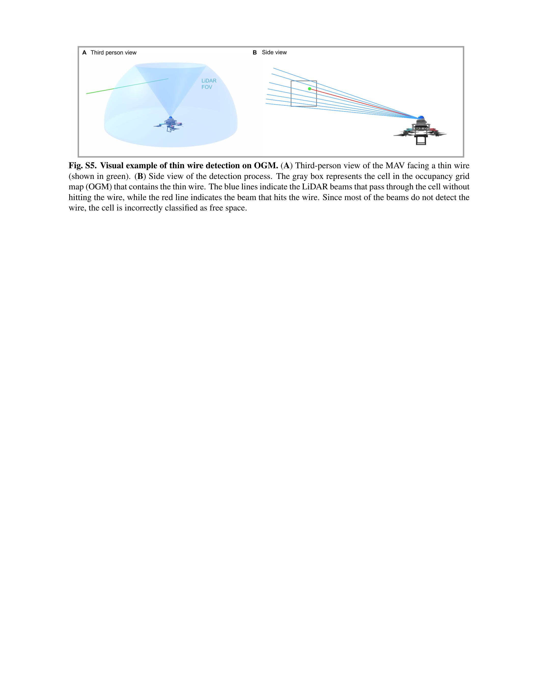 Fig. S5. OGM 上细线检测的视觉示例 (A) 无人机面对细线(绿色显示)的第三人称视角。 (B) 检测过程的侧视图。灰色框代表占据栅格地图(OGM)中包含细线的栅格。蓝线表示穿过该栅格但未击中细线的 LiDAR 光束,红线表示击中细线的光束。由于大多数光束未检测到细线,该栅格被错误地分类为自由空间。
