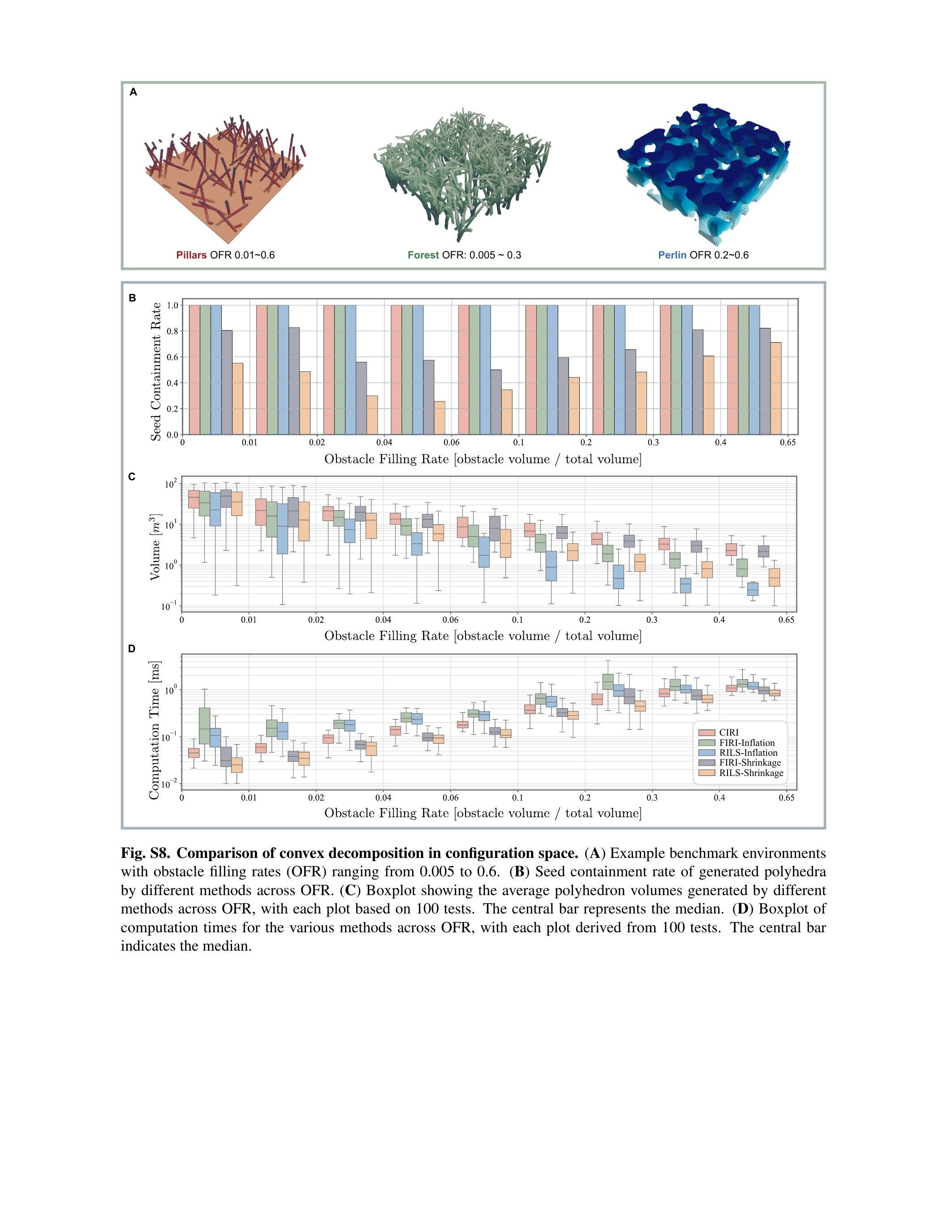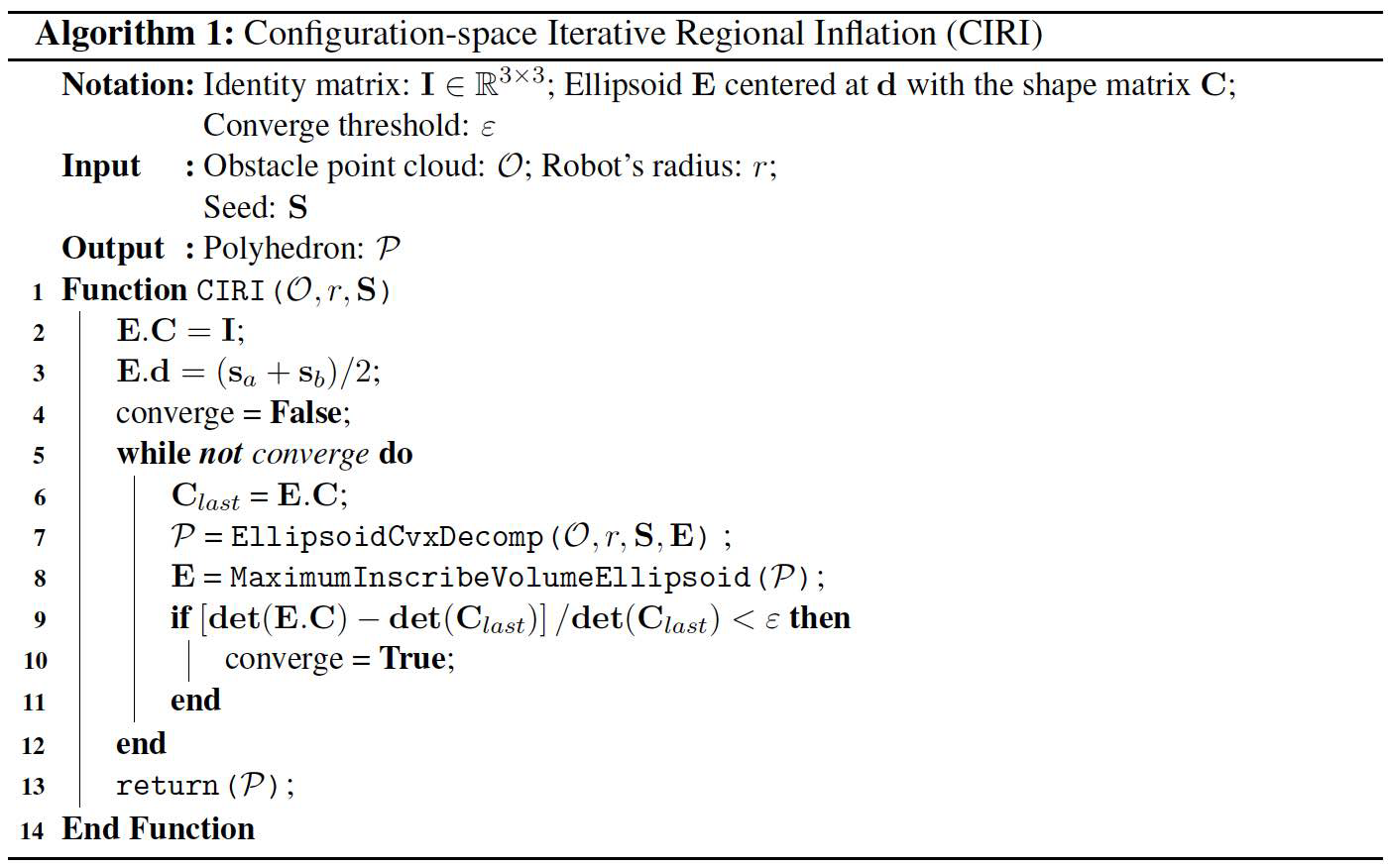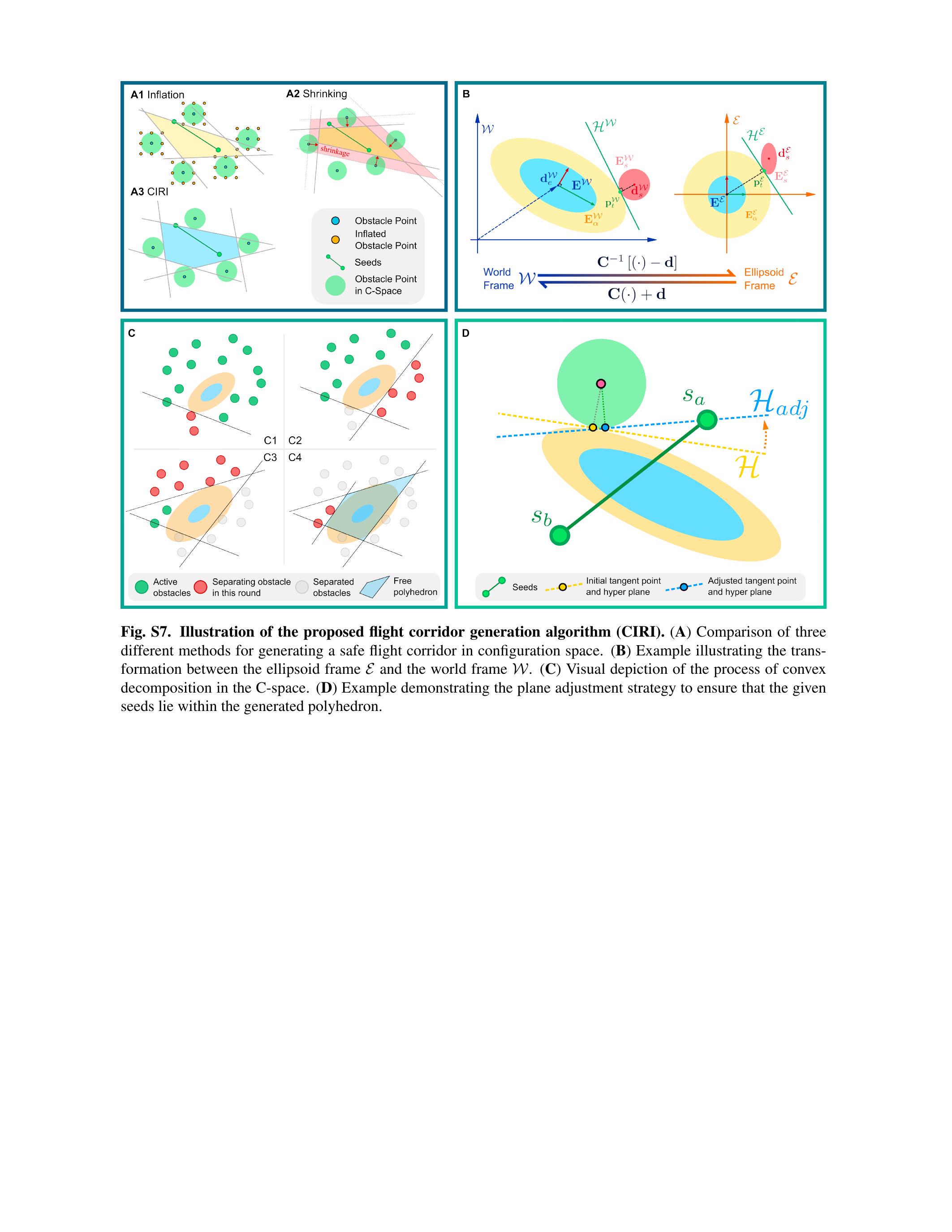 凸分解需在机器人场景空间中进行以考虑无人机体积。现有方法如快速迭代区域膨胀(FIRI)(58)、带线搜索的区域膨胀方法(40)及其前身带半正定规划的迭代区域膨胀方法(59)通过点膨胀或平面收缩处理机器人体积。我们提出场景空间迭代区域膨胀 (CIRI) 新方法。CIRI继承了FIRI(58)中的迭代优化过程及基于二阶锥规划的最大内接椭圆体积算法,但区别于前述方法(59,40,58),CIRI直接对输入点云操作,在无人机场景空间内提取多面体,无需先验地图膨胀(3,12,60)或多面体收缩(40,61)。此外,CIRI采用平面调整策略,确保场景空间生成的多面体包含线段种子。相较于现有点膨胀和平面收缩策略(62,58),CIRI获得的多面体体积更大,计算时间更短,且保证场景空间中完全包含线段种子(见图S8)。CIRI方法细节见补充材料。