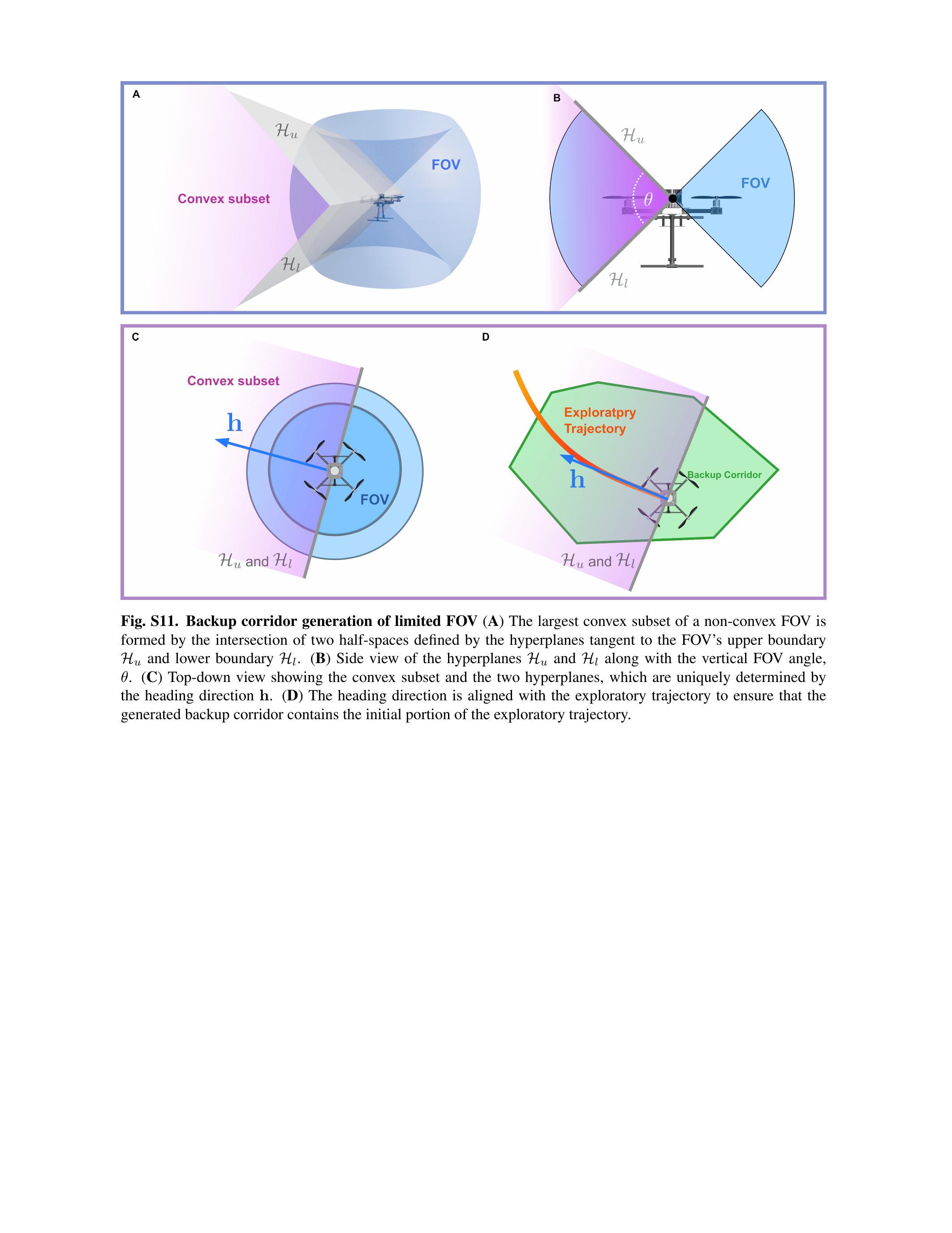 基于定理1,详细过程见图8C。种子选取为从当前位姿 \(\mathbf{p}_{\mathrm{c}}\) 出发、至探索轨迹 \(\mathcal{T}_{\mathrm{e}}\) 上 \(\mathbf{p}_{\mathrm{c}}\) 可视的最远点 \(\mathbf{s}\) 的线段(图8C,i)。目的在于利用CIRI算法提取的包含种子(\(\mathbf{p}_{\mathrm{c}}, \mathbf{s}\))的备份走廊与探索轨迹对齐,进而包含大量探索轨迹。考虑激光雷达非无限密集,为形成足够密集深度图,将近期激光雷达扫描(如1至2秒)累积输入CIRI及线段种子,获得凸多面体 \(S\)(图8C,ii)。根据定理1,多面体 \(S\) 内区域保证为已知自由空间。若激光雷达视场有限,可使用多面体 \(S\) 与视场凸子集的交集(图8C,iii),该交集形成另一多面体,位于已知自由空间内。此外,探索走廊首个多面体亦须与MAV视场相交,确保探索轨迹初段处于已知自由空间,提升备份轨迹优化的可行性。视场凸子集的选择方法及其影响分析见补充材料。