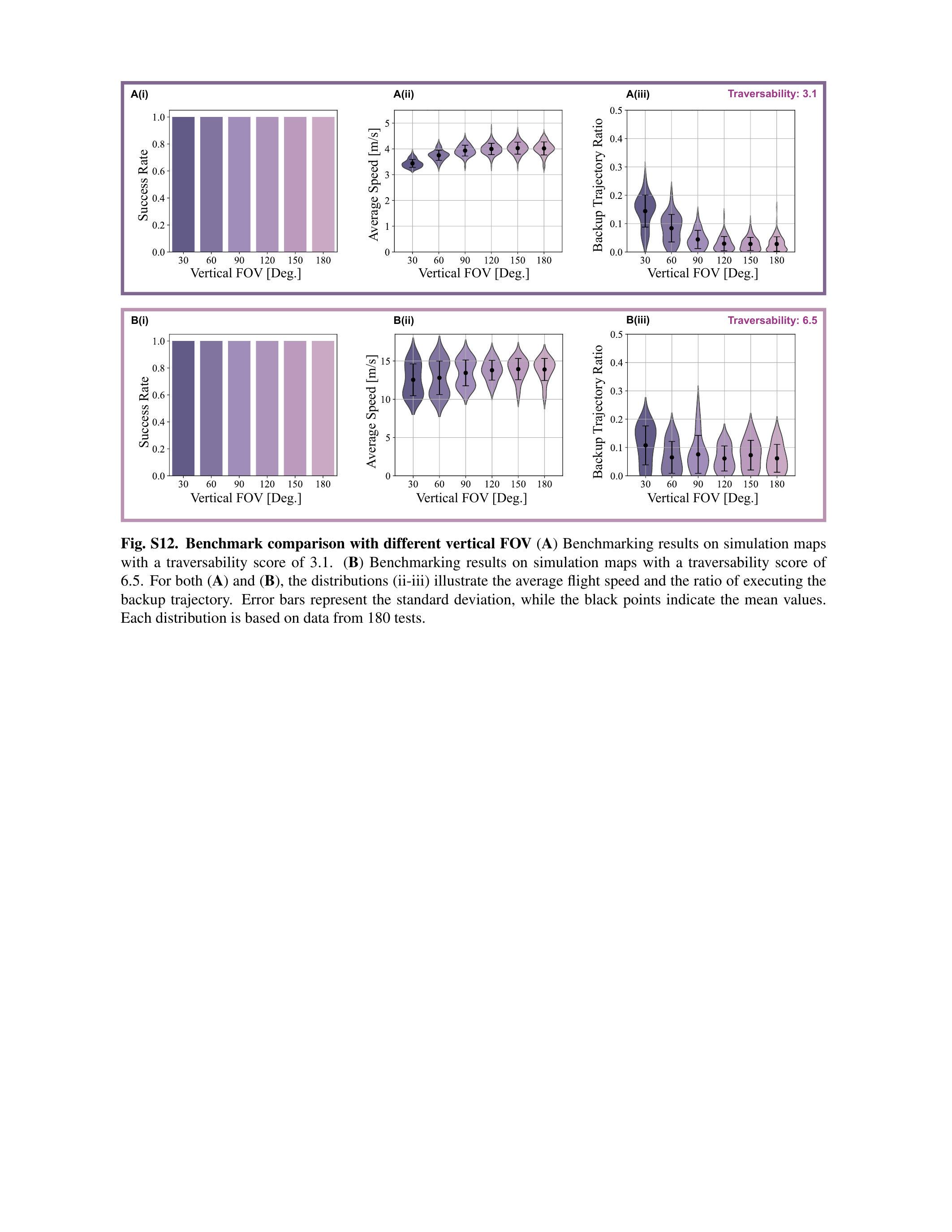 我们通过一系列仿真实验评估了SUPER规划模块的性能。测试环境由一组尺寸固定为110×20米的随机生成类森林三维场景组成(图6A)。场景涵盖六种不同障碍密度,按可通行性(traversability)指标变化范围为3.1至6.5(30)。可通行性为障碍密度相对于机器人尺寸(本模拟中最大半径 \(r=0.2 \mathrm{~m}\))的归一化度量,数值越高表示避障任务越简单。每个场景中,障碍物的位置和倾斜角随机生成。为保证多样性,每种密度使用不同随机种子生成10张地图,共计60张地图用于评估。我们将SUPER的性能与三种先进基线规划器对比:Bubble规划器,一种乐观规划策略(13);Raptor,一种安全感知方法(20);Faster,一种安全保障方法(23)。四个规划器的实现细节汇总见表S1。每个规划器在每张地图上运行18次,最大速度从1至 \(18 \mathrm{~m} / \mathrm{s}\) 不等。最大加速度固定为 \(20 \mathrm{~m} / \mathrm{s}^{2}\)。每次实验中,规划器需使MAV从起点飞向100米外目标,实验在三种条件之一时结束。“成功”指MAV无碰撞且满足所有运动学约束(速度和加速度);“碰撞”指飞行中与障碍物发生碰撞;“未完成”指在达到目标前任一重规划周期内,规划器未能在30秒内返回轨迹。