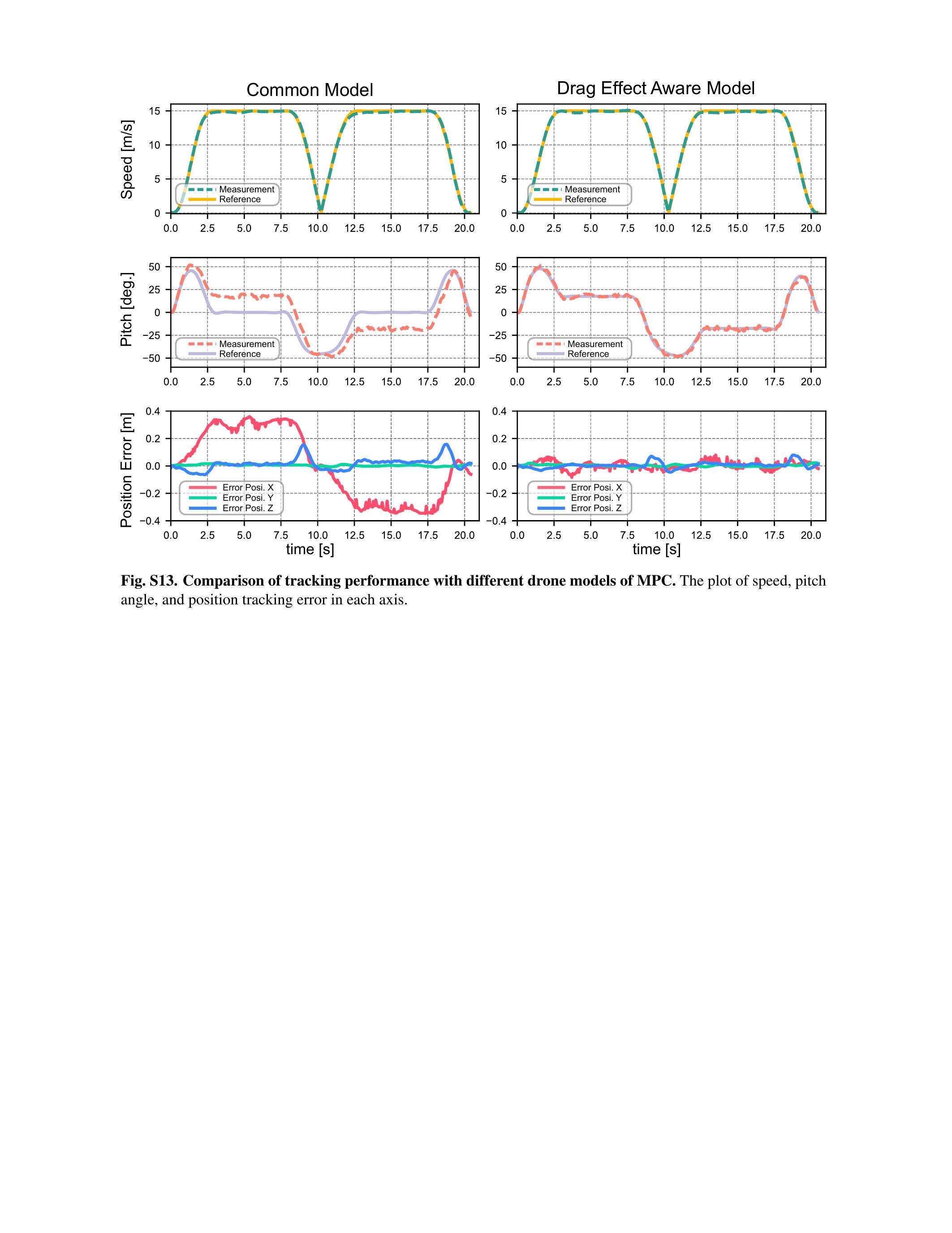 Fig. S13. 不同无人机模型下 MPC 跟踪性能比较。速度、俯仰角和各轴位置跟踪误差的绘图。