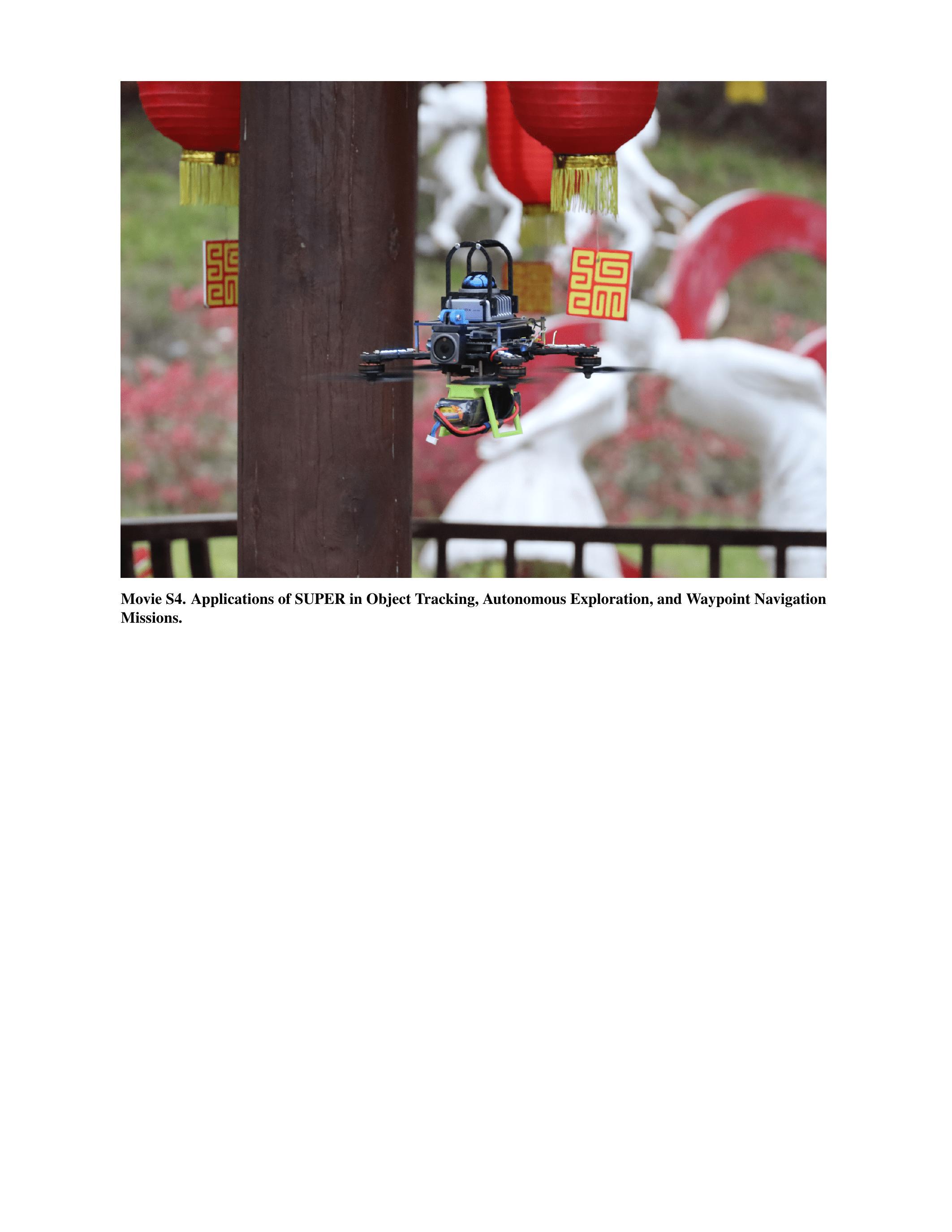 视频 S4. SUPER 在目标跟踪、自主探索和航路点导航任务中的应用。