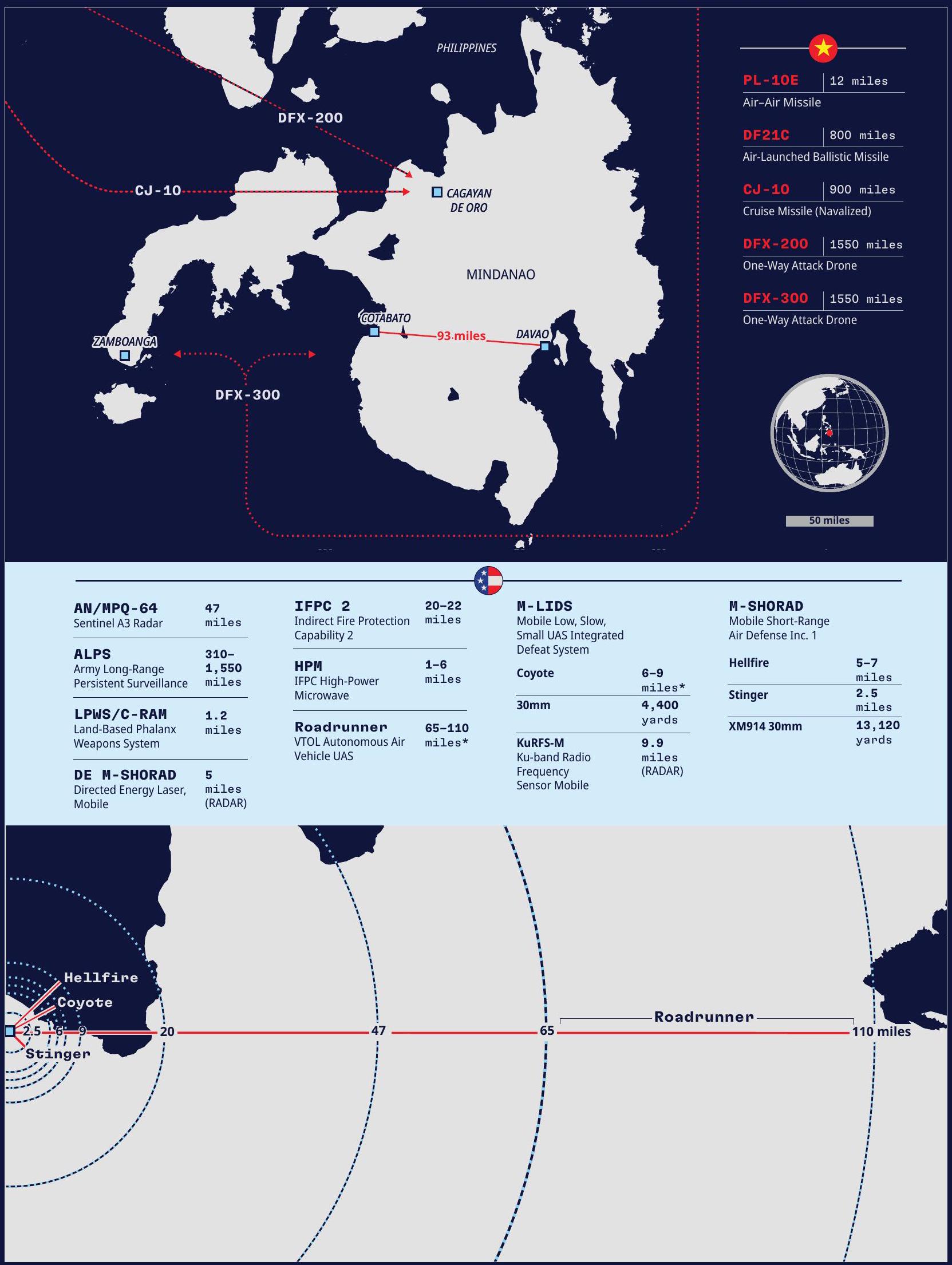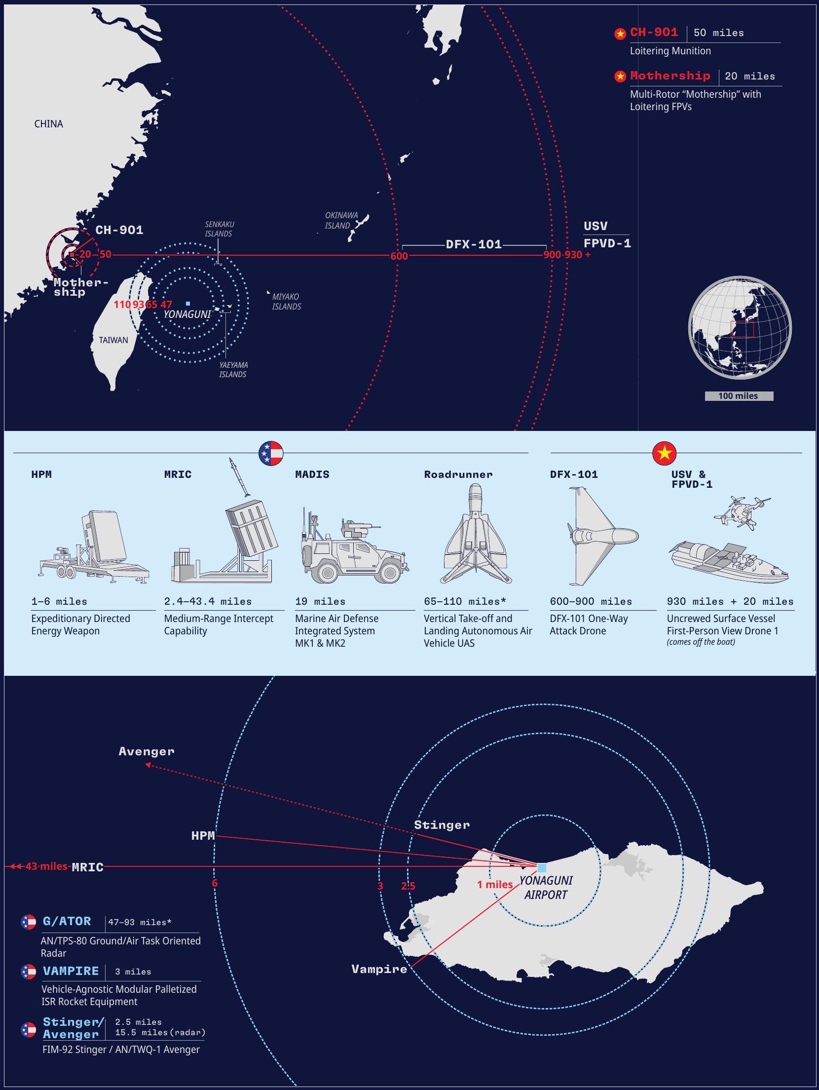 - The authors intentionally limited the role of the U.S. Navy in countering the drones for several reasons. First, the surface fleet possess layered defenses that can repel many drone strikes, but these systems would have been strained in this scenario. Naval air defenses likely would have been seriously depleted (as ground-based Patriot and Terminal High Altitude Area Defense [THAAD] interceptors were in this scenario) and in very high demand. Moreover, a reduced but persistent threat to the United States would make operating in the First Island Chain risky. Thus, the TTX emphasized the employment of ground-based C-UAS defenses without relying on naval support.