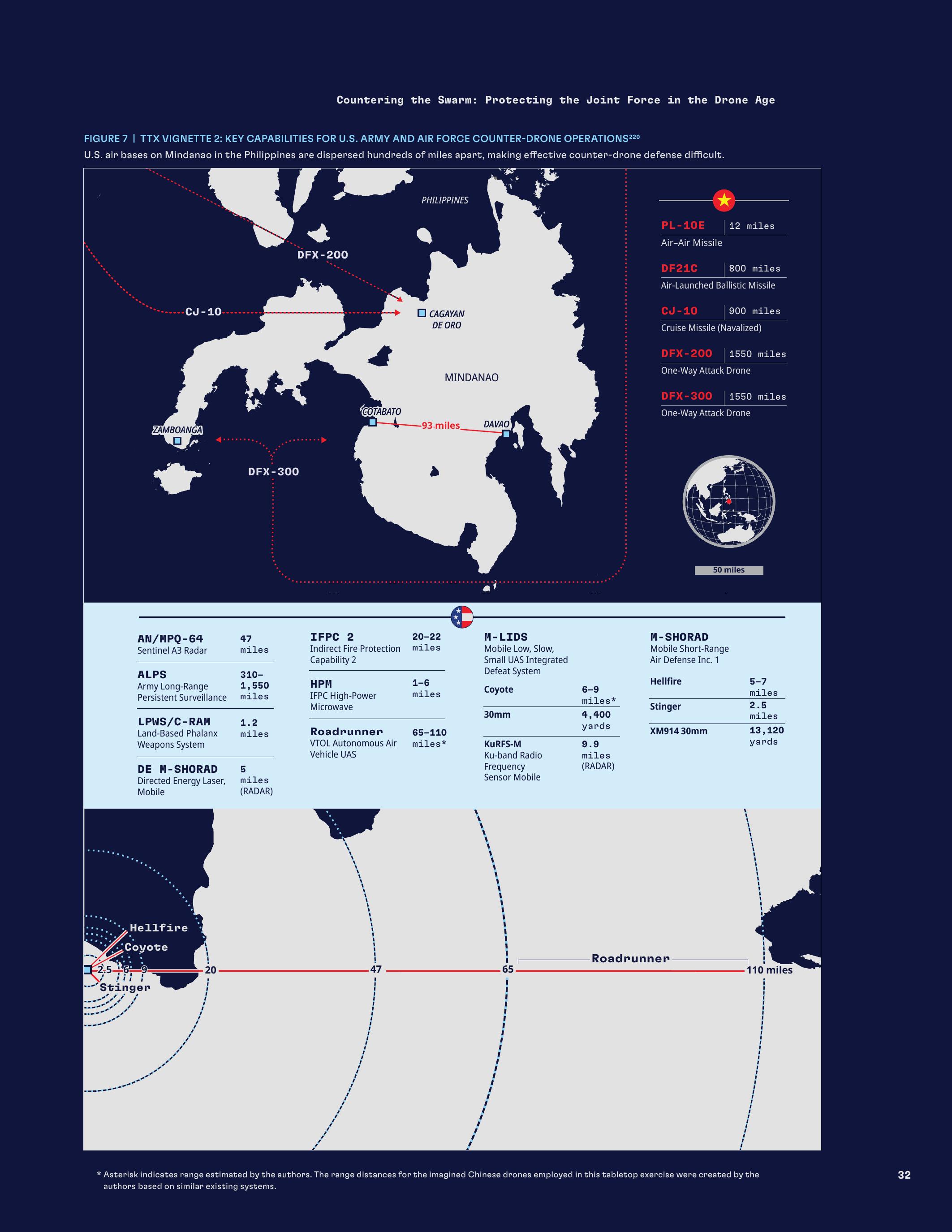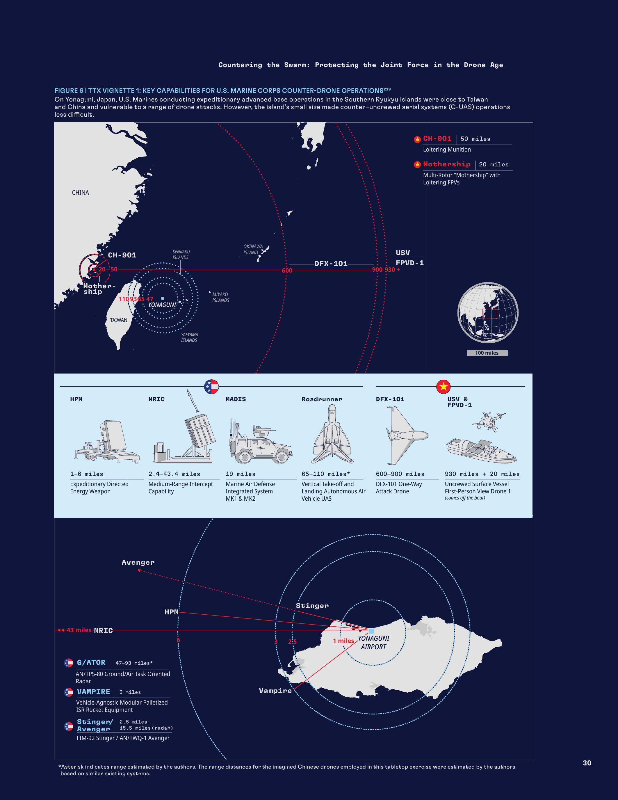 - The authors intentionally limited the role of the U.S. Navy in countering the drones for several reasons. First, the surface fleet possess layered defenses that can repel many drone strikes, but these systems would have been strained in this scenario. Naval air defenses likely would have been seriously depleted (as ground-based Patriot and Terminal High Altitude Area Defense [THAAD] interceptors were in this scenario) and in very high demand. Moreover, a reduced but persistent threat to the United States would make operating in the First Island Chain risky. Thus, the TTX emphasized the employment of ground-based C-UAS defenses without relying on naval support.